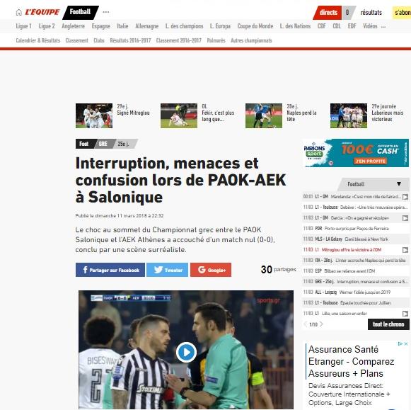 ΗEquipe στη Γαλλία σχολιάζει την εισβολή του μεγαλομετόχου του ΠΑΟΚ ως εξής:«Διακοπή, απειλές και χάος κατά τη διάρκεια του ΠΑΟΚ-ΑΕΚ στη Θεσσαλονίκη».