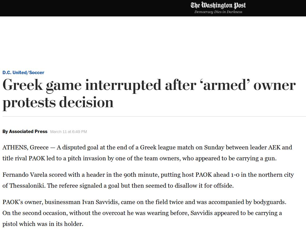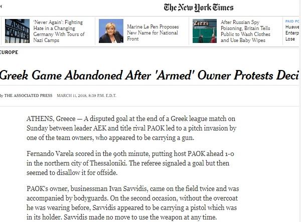 Συγκεκριμένα οι New York Times αναφέρουν για τα έκτροπα της Τούμπας:«Διακοπή σε παιχνίδι ελληνικού πρωταθλήματος έπειτα από εισβολή ιδιοκτήτη με όπλο για να διαμαρτυρηθεί».