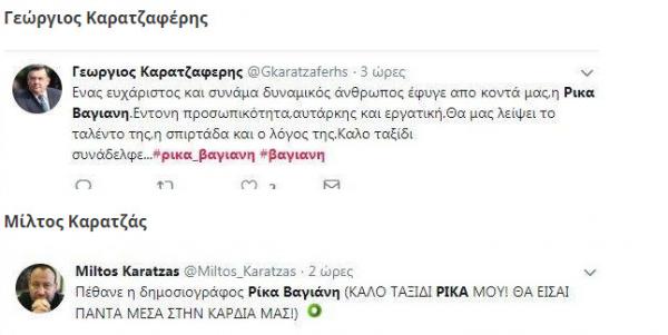 Αποχαιρετιστήρια μηνύματα στα Social Media έστειλαν και οι Γιώργος Καρατζαφέρης, Κατερίνα Καινούριου, Χρήστος Δάντης, Έλενα Ακρίτα και Αγγελική Νικολούλη.