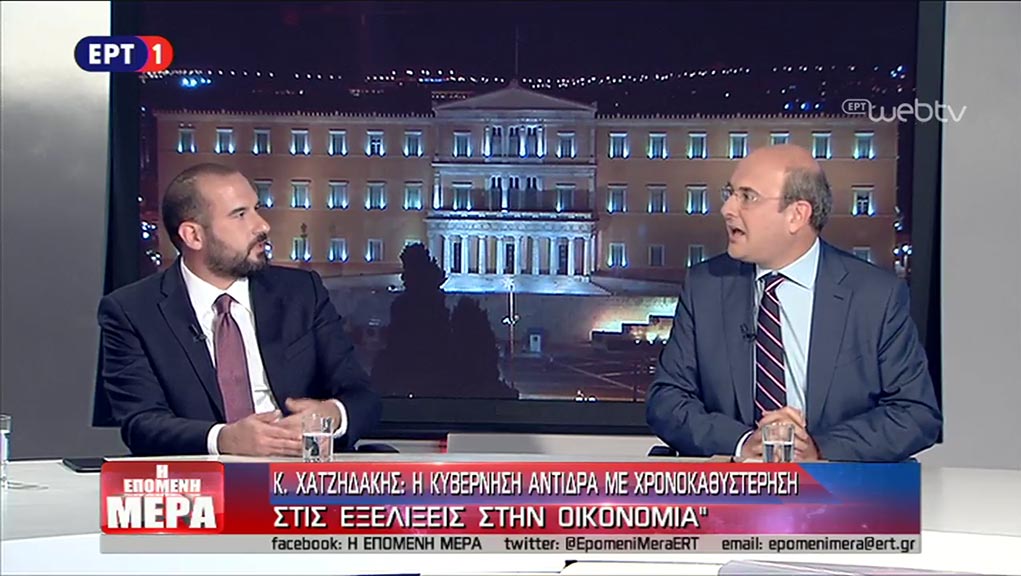 Σφοδρή αντιπαράθεση μεταξύ του κυβερνητικού εκπροσώπου και του αντιπροέδρου της ΝΔ Κ. Χατζηδάκη προκάλεσε το θέμα των φόρων και της ανάπτυξης, με τον κ. Τζανακόπουλο να κατηγορεί τον συνομιλητή του ότι παρουσιάζει ψευδή στοιχεία.