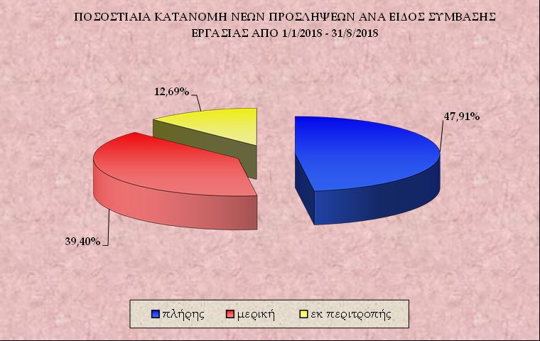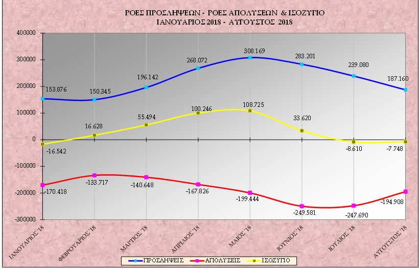Συγκεκριμένα, σύμφωνα με τα στοιχεία των ροών μισθωτής απασχόλησης του Αυγούστου 2018, οι αναγγελίες πρόσληψης ανήλθαν σε 187.160, ενώ οι αποχωρήσεις σε 194.908.
