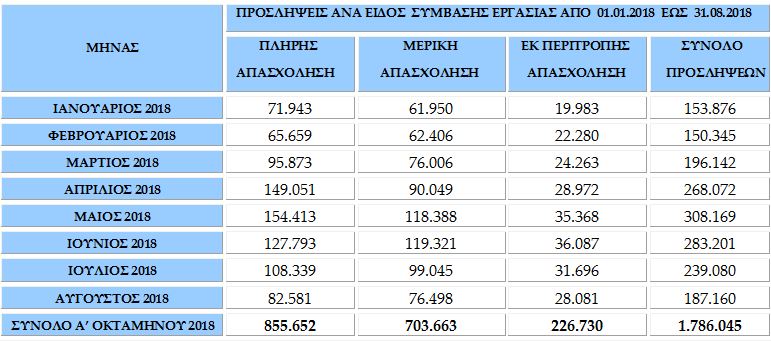 Αθροιστικά, για την περίοδο Ιανουάριος–Αύγουστος 2018, οι αναγγελίες προσλήψεων ανήλθαν σε 1.786.045 θέσεις εργασίας και οι αποχωρήσεις έφτασαν το 1.504.232, εκ των οποίων οι 863.552 ήταν αποτέλεσμα καταγγελιών συμβάσεων αορίστου χρόνου ή λήξεων συμβάσεων ορισμένου χρόνου και οι 640.680 οικειοθελείς αποχωρήσεις.