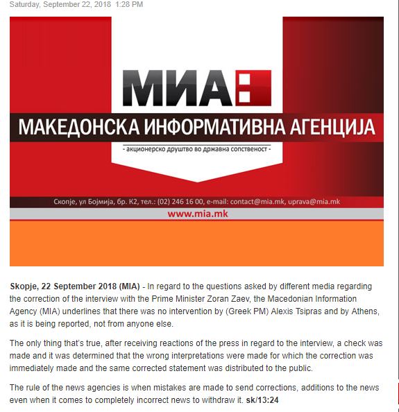 Σε διευκρίνιση για την ανασκευή των δηλώσεων του σκοπιανού πρωθυπουργού, Ζόραν Ζάεφ, περί μοναδικής Μακεδονίας προχώρησε το κρατικό πρακτορείο ΜΙΑ της ΠΓΔΜ.