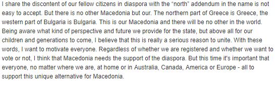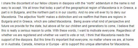 «Όλοι γνωρίζουμε ότι σήμερα ένα κομμάτι της γεωγραφικής περιοχής της Μακεδονίας είναι στην Ελλάδα, άλλο στη Βουλγαρία και το βόρειο κομμάτι είναι στη χώρα μας» ανέφερε ο Ζάεφ, διευκρινίζοντας παράλληλα πως ο προσδιορισμός «Βόρεια», που θα προστεθεί στην νέα ονομασία, ξεχωρίζει την ΠΓΔΜ από τις περιοχές της Ελλάδας και της Βουλγαρίας.