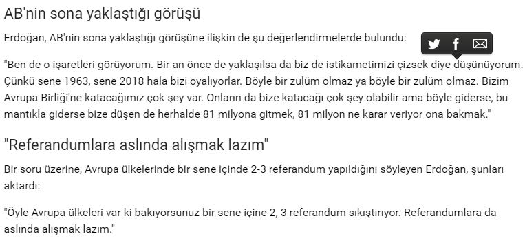 Μάλιστα κατά τη διάρκεια ομιλίας του την Πέμπτη ο Ερντογάν εμφανίστηκε εξοργισμένος με την αργοπορία των ενταξιακών συνομιλιών και ανέφερε: ότι από το 1963 φτάσαμε στο 2018 και ακόμα μας έχουν στην αναμονή. Και πρόσθεσε ότι η ΕΕ έχει πολλά να δώσει στην Τουρκία αλλα και η Τουρκία έχει πολλά να δώσει στην ΕΕ, για να σημειώσει ότι: Είναι δικαίωμα της Άγκυρας να προσφύγει στα 81 εκατομμύρια λαού και να δούμε τι απόφαση θα βγάλουν αυτά τα 81 εκατομμύρια.