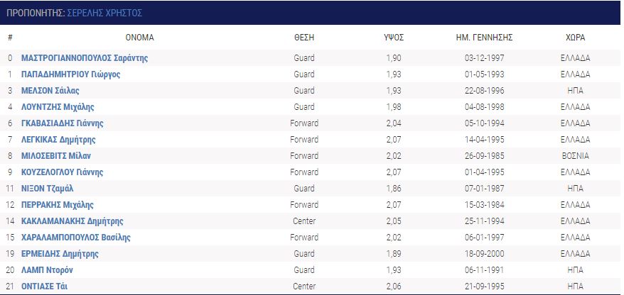 Κλαρκ και Σκορδίλης είναι οι μόνοι παίκτες που παραμένουν από εκείνους που ουσιαστικά πρωταγωνίστησαν στην επιβλητική πορεία της ομάδας πέρσι στην Α2. Επίσης αποκτήθηκε ο χρήσιμος γκαρντ Βασίλης Μουράτος και αρκετά ακόμη νέα παιδιά όπως ο δανεικός από την ΑΕΚ Γιάννης Αραβάνης.