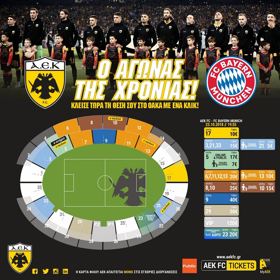 «Με τις προνομιακές τιμές του ηλεκτρονικού εισιτηρίου στη Θύρα 5, με Deals For You στη Θύρα 23 και για πρώτη φορά με έκδοση παιδικού εισιτηρίου ηλεκτρονικά και στις Θύρες 10 και 21 εκτός από τη Θύρα 13 ξεκινά η ηλεκτρονική προπώληση των εισιτηρίων του μεγάλου αγώνα με την Μπάγερν.