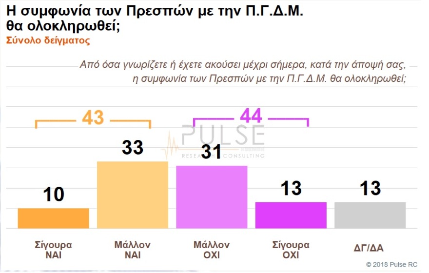 Συγκεκριμένα σμφωνα με την νέα δημοσκόπηση της Pulse για λογαριασμό του ΣΚΑΪ, το 44% των πολιτών εκτιμά με μερική ή απόλυτη βεβαιότητα πως η Συμφωνία των Πρεσπών δεν θα κυρωθεί οριστικά και από τις δύο χώρες, ενώ στον αντίποδα το 43% απαντά πως η Συμφωνία θα φτάσει έως το τέλος.