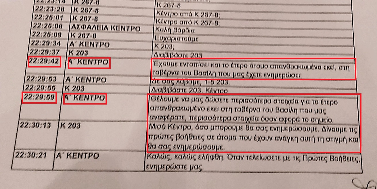 Ομως τώρα από την δικογραφία της υπόθεσης ανακύπτει ότι υπήρχε ενημέρωση όλης της ΕΛ.ΑΣ για ανεύρεση νεκρών 40 λεπτά νωρίτερα από τον προαναφερθέντα εντοπισμό νεκρών. Τα νεώτερα στοιχεία προκύπτουν από συνομιλίες που καταγράφηκαν στο επιχειρησιακό Κέντρο της Κρατικής Ασφάλειας όταν και στις 10.29 υπάρχουν αναφορές για τον εντοπισμό δύο απανθρακωμένων πτωμάτων στην ταβέρνα του «Βασίλη» κοντά στη λεωφόρο Μαραθώνος. Με τους αστυνομικούς να αναφέρουν ότι ειδοποιήθηκαν, πριν από αυτή την ενημέρωση, πως θα πρέπει να βοηθήσουν άτομα που χρειάζονται πρώτες βοήθειες.