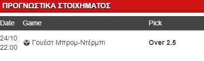 Η Ντέρμπι του Φρανκ Λάμπαρντ δεν θα είναι εύκολος αντίπαλος, μπορεί να κάνει παιχνίδι ανάλογο με αυτό της Γουίγκαν και να μπλοκάρει τους γηπεδούχους, δέχεται όμως συνεχώς γκολ τελευταία και με τη Μπρόμιτς αυτό δεν είναι καλός οιωνός. Τα γκολ μας ενδιαφέρουν, όχι τα 2-3 αυτή τη φορά, αλλά το Over 2.5 που βρίσκουμε στο 1.80, εκτιμώντας ότι η καλύτερη επίθεση της Τσάμπιονσιπ θα επιστρέψει δριμύτερη κι αν βοηθήσουν και τα «κριάρια» στο σκοράρισμα ακόμα καλύτερα.
