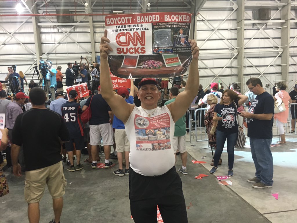 Ο Σέιοκ (πρώτο πλάνο) με πλακάτ κατά του CNN σε συγκέντρωση του Τραμπ