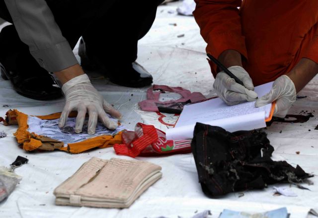 Πάνω σε λινάτσες στο λιμάνι της Τζακάρτας αστυνομικοί τοποθετούσαν αντικείμενα που περισυνελέγησαν από τα νερά: από μέρη του εξοπλισμού του αεροπλάνου, όπως φιάλες οξυγόνου, ως προσωπικά αντικείμενα, πορτοφόλια, κινητά τηλέφωνα, μετρητά, σακίδια πλάτης και άλλα.