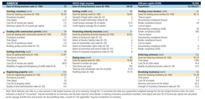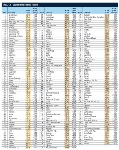 Η Ελλάδα για τέταρτη συνεχόμενη χρονιά υποχωρεί στην παγκόσμια κατάταξη και βρίσκεται πλέον πίσω από χώρες όπως η Ουκρανία (71), το Βιετνάμ (69), το Περού (68), η Αλβανία (63), η Κένυα (61), η Ρουάντα (29) και τα Σκόπια (10), ενώ η ευκολία του επιχειρείν στην Ελλάδα ίσα που ξεπερνά αυτή της Μογγολίας, του Ουζμπεκιστάν και του Ομάν.
