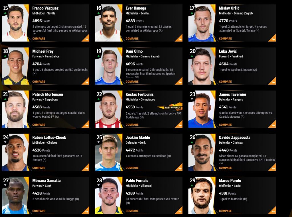 Ο Φόρτου από το καλοκαίρι και τα προκριματικά της διοργάνωσης μετράει 4 γκολ και 5 ασίστ, ενώ έχει συμμετοχή και στο γκολ του Ολυμπιακού κόντρα στην Ντουντελάνζ στο Λουξεμβούργο. Πέρα από τον Φορτούνη πάντως στη σχετική λίστα βρίσκεται και ο Βασίλης Τοροσίδης, ο οποίος φιγουράρει στην 62η θέση έχοντας πετύχει δύο τέρματα. Στην κορυφή των πιο φορμαρισμένων του Εuropa δεσπόζει ο Σεμπάστιαν Χάλερ της Αϊντραχτ Φρανκφούρτης και πίσω του ο Τζιοβάνι Λο Σέλσο της αντιπάλου των ερυθρόλευκων, Ρεάλ Μπέτις, ενώ ο Σωκράτης Παπασταθόπουλος βρίσκεται στην 42η θέση.