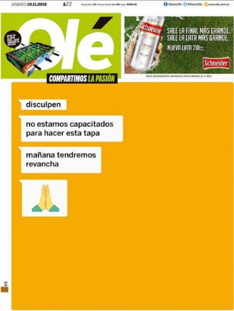 Ο λόγος για την Ole, που ζητά «συγγνώμη. Δεν είμαστε ικανοί να φτιάξουμε αυτήν την πρώτη σελίδα. Αύριο θα πάρουμε ρεβάνς». Πρωτοτυπία ή… έλλειψη έμπνευσης;
