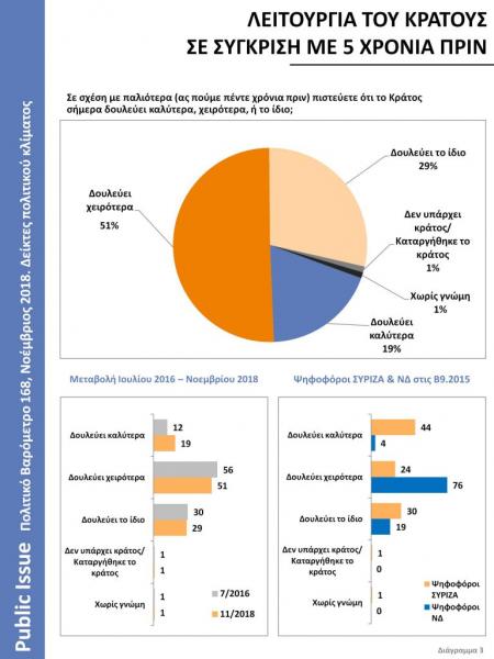 Στο ερώτημα για το πώς λειτουργεί το κράτος σε σχέση με πριν από πέντε χρόνια, μόλις το 19% λέει ότι λειτουργεί καλύτερα ενώ το 51% ότι λειτουργεί χειρότερα.