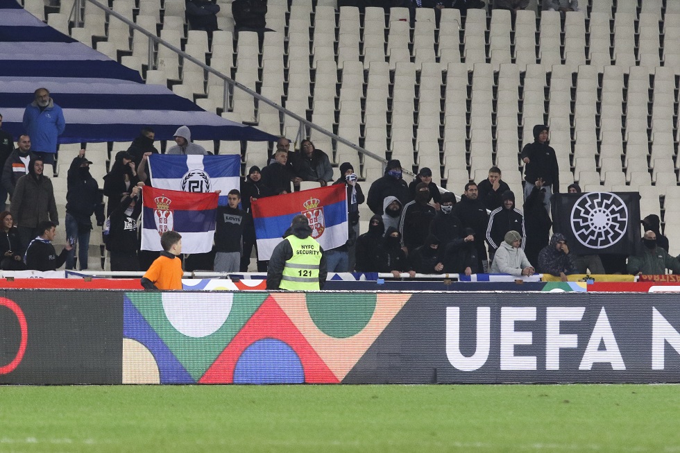 Λιγότεροι από 1.500 έδωσαν το παρών στο ΟΑΚΑ, στο παιχνίδι της Εθνικής κόντρα στην Εσθονία για την 6η αγωνιστική του Nations League. Τα άδεια καθίσματα του Ολυμπιακού Σταδίου όμως, ήταν λιγότερο θλιβερή εικόνα, από εκείνη μιας μερίδας «φιλάθλων» της Γαλανόλευκης που εθεάθησαν στο κάτω διάζωμα και στα πρώτα καθίσματα του γηπέδου να χαιρετούν ναζιστικά, να φωνάζουν συνθήματα για τη Βόρεια Ήπειρο, την Αλβανία, τη Μακεδονία, το Πολυτεχνείο, όλα «βουτηγμένα» σε ναζιστικά ιδεώδη, κρατώντας παράλληλα μια σημαία του «Μαύρου ήλιου».