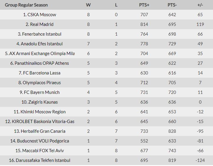 Ο Ολυμπιακός επικράτησε της Ρεάλ Μαδρίτης στο ΣΕΦ με 88-83 και την υποχρέωσε στην πρώτη της ήττα στην Ευρωλίγκα. Στα υπόλοιπα παιχνίδια του πρώτου σετ της 9ης αγωνιστικής η Εφές Αναντολού κέρδισε την Νταρουσάφακα με 88-93, η Φενερμπαχτσέ του Ζέλιμιρ Ομπράντοβιτς πέρασε από το Τελ Αβίβ με νίκη επί της Μακάμπι του Γιάννη Σφαιρόπουλου με 74-70. Στο τελευταίο χρονικά παιχνίδι της βραδιάς η Μπάγερν Μονάχου επικράτησε εκτός έδρας της Γκραν Κανάρια με 89-74 συνεχίζοντας την πολύ της καλή πορεία στη διοργάνωση.