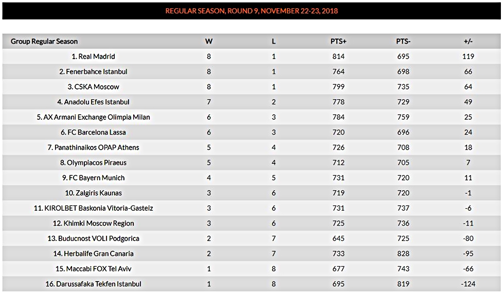 Αναλυτικά η βαθμολογία με την 9η αγωνιστική της Euroleague, συμπληρωμένη: