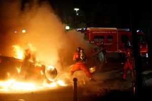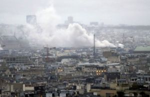 Την ίδια ώρα, πυροσβέστες πραγματοποιούν επιχείρηση κατάσβεσης φωτιάς σε κτίριο κοντά στα Ηλύσια Πεδία. Οι καπνοί από τις φωτιές που έβαλαν διαδηλωτές κάλυψαν μεγάλο μέρος της πόλης.