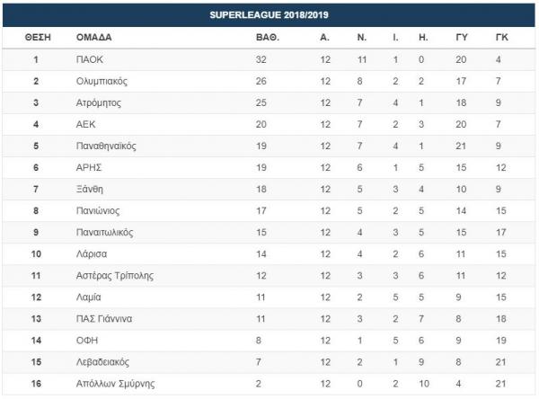 Ας δούμε την τελική μορφή του βαθμολογικού πίνακα της Superleague με την 12η αγωνιστική συμπληρωμένη: