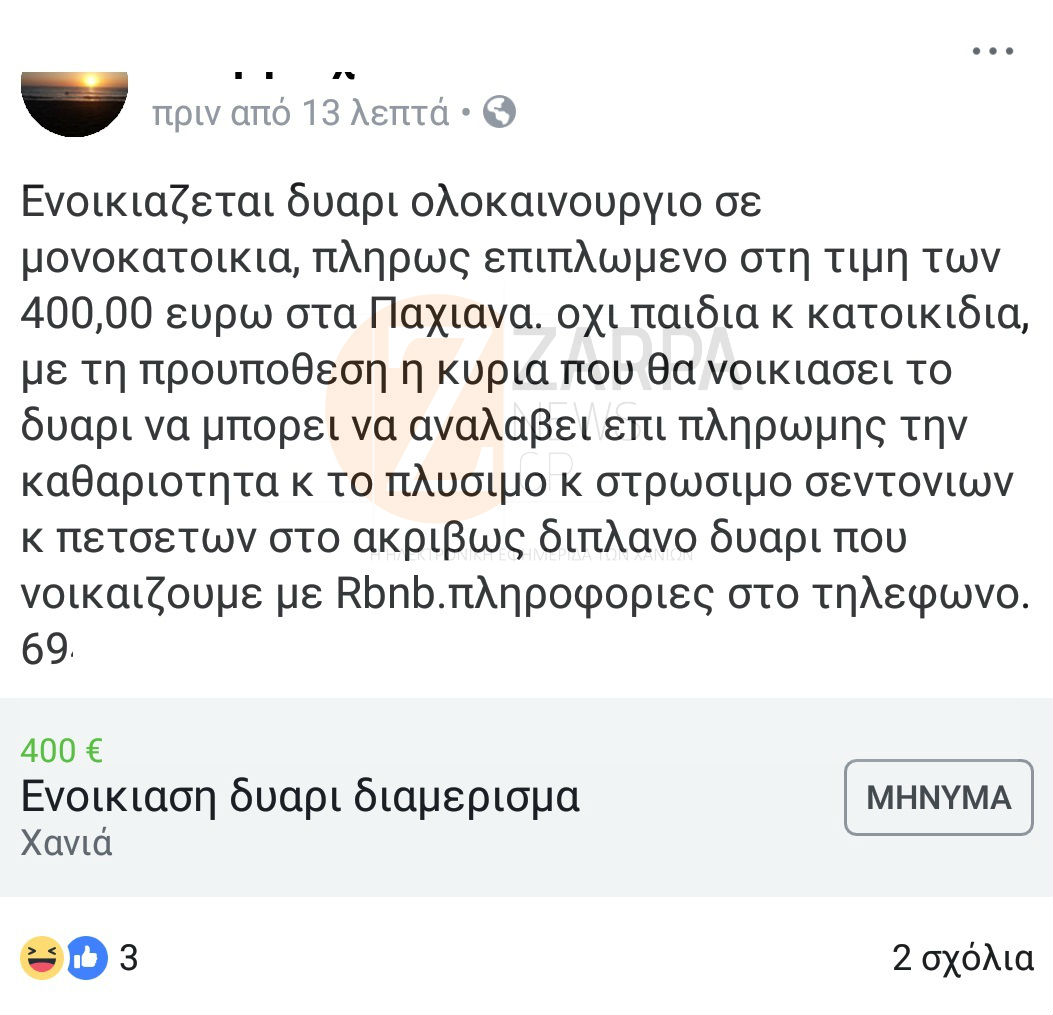 Με την προϋπόθεση να καθαρίζει το διπλανό σπίτι για τους τουρίστες της AirBnb και να τους αλλάζει σεντόνια και πετσέτες, μπορεί να ενοικιάσει κάποιος ένα δυάρι στα Παχιανά, στην τιμή των 400 ευρώ.