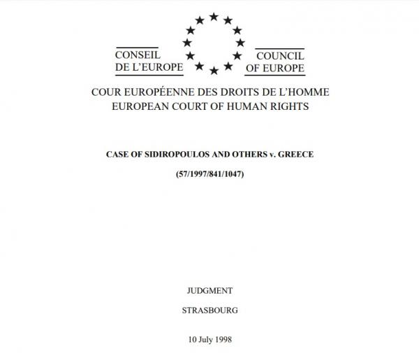 Οι ενάγοντες κατέθεσαν αίτηση αναίρεσης της απόφασης του εφετείου στον Άρειο Πάγο η οποία απερρίφθη το 1994, οπότε αποφάσισαν να πάνε την υπόθεση τους στο Στρασβούργο, στο Ευρωπαικό Δικαστήριο για τα Ανθρώπινα Δικαιώματα (ΕΔΔΑ). Η υπόθεση τιτλοφορείται Σιδηρόπουλος και Λοιποί κατά Ελλάδας και η απόφαση εκδόθηκε στις 10 Ιουλίου του 1998. Η Ελλάδα καταδικάστηκε για παραβίαση του άρθρου 11 της Ευρωπαικής Σύμβασης για τα Δικαιώματα του Ανθρώπου, δηλαδή για παραβίαση της ελευθερίας του συνεταιρίζεσθαι, καθώς το δικαστήριο έκρινε πως «προληπτική» στέρηση του δικαιώματος δεν μπορεί να υφίσταται και πως τα ελληνικά δικαστήρια δεν τεκμηρίωσαν τις προθέσεις που καταλόγισαν τους ιδρυτές του σωματείου στις αποφάσεις τους. Στους ενάγοντες επιδικάστηκαν αποζημιώσεις συν το ποσό των νομικών τους εξόδων, συνολικά 4.000.000 δραχμές.