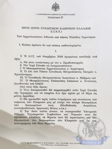 Ο Αρχιεπίσκοπος παρέδωσε στα μέλη του ΙΣΚΕ υπόμνημα μέσα στο οποίο διευκρινίζει ότι πως οποιαδήποτε απόφαση ληφθεί θα διασφαλίζει τα δικαιώματα του κλήρου (μισθοδοσία, ασφάλεια, συνταξιοδότηση, οργανικές θέσεις κλπ) και να κατοχυρωθεί ΣΥΝΤΑΓΜΑΤΙΚΩΣ η μισθοδοσία των κληρικών.