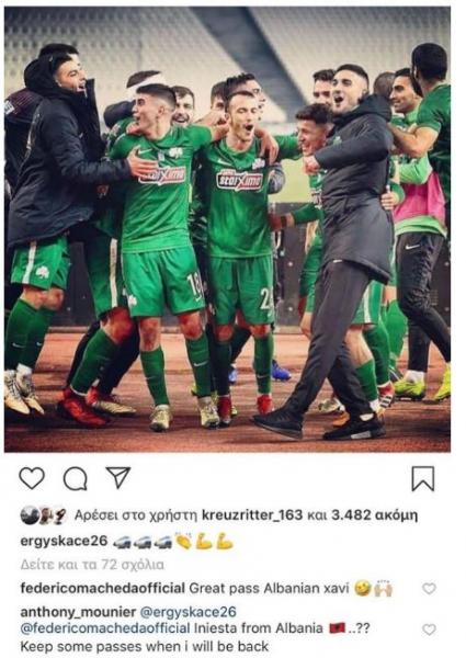 Μετά το τέλος της αναμέτρησης ο Ιταλός επιθετικός αποθέωσε τον συμπαίκτη του μέσω Instagram γράφοντας: «Υπέροχη πάσα από τον Αλβανό Τσάβι». Εν συνεχεία την δημοσίευση του Μακέντα σχολίασε ο Μουνιέ συμπληρώνοντας: «Ινιέστα από την Αλβανία. Kράτα μερικές ακόμη πάσες για όταν θα επιστρέψω».