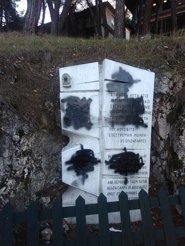 Άγνωστοι βεβήλωσαν ανήμερα των Χριστουγέννων το μνημείο που έχει κατασκευαστεί προς τιμήν των Εβραίων της Καστοριάς, τους οποίους οι ναζιστικές δυνάμεις της κατοχής τον Μάρτιο του 1944, μετέφεραν και εξόντωσαν στο στρατόπεδο συγκέντρωσης ‘Αουσβιτς – Μπίρκεναου.