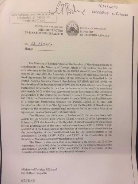 Το υπουργείο Εξωτερικών της ΠΓΔΜ ανακοίνωσε το βράδυ ότι επέδωσε στον επικεφαλής του Γραφείου Συνδέσμου της Ελλάδας στα Σκόπια ρηματική διακοίνωση, με την οποία τα Σκόπια ενημερώνουν την Αθήνα για την ολοκλήρωση των εσωτερικών νομικών διαδικασιών στην ΠΓΔΜ, προκειμένου να τεθεί σε ισχύ η Συμφωνία των Πρεσπών και ότι η Βουλή της ΠΓΔΜ ενέκρινε, στις 11 Ιανουαρίου, τις τροπολογίες του Συντάγματος της χώρας.