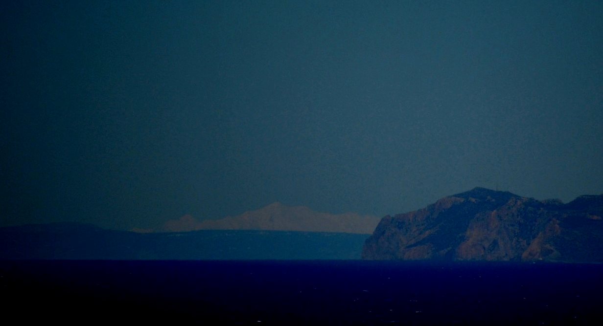 «Αυτή τη φωτογραφία (κάτω) την τράβηξα χθες από τα Φαλάσαρνα. Το νησί μπροστά είναι τα Αντικύθηρα και πίσω τα χιονισμένα βουνά ο Ταΰγετος.