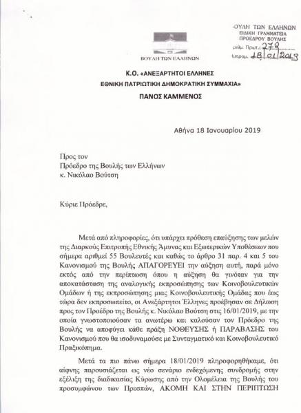 Σχετική επιστολή απηύθυνε στον πρόεδρο της Βουλής Νίκο Βούτση ο επικεφαλής των ΑΝΕΛ Πάνος Καμμένος, καλώντας τον να μην προχωρήσει σε τέτοιες ενέργειες και προειδοποιώντας τον ότι σε αντίθετη περίπτωση θα έχει κάνει «νόθευση» και θα αποτελούσε συνταγματικό και κοινοβουλευτικό πραξικόπημα.