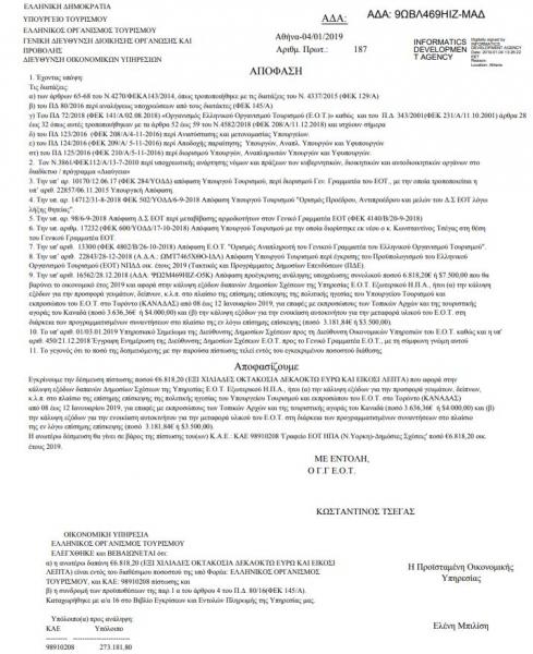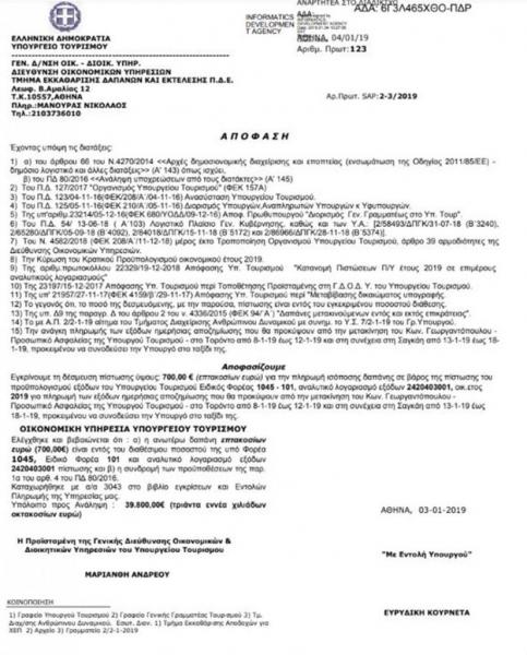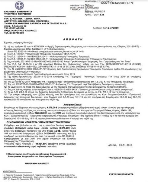 Σύμφωνα με την από 4 Ιανουαρίου 2018 απόφαση της γενικής γραμματέα Τουρισμού, Ευρυδίκης Κουρνέτα, «εγκρίνουμε τη δέσμευση πίστωσης ύψους: 21.056,40 ευρώ (είκοσι μίας χιλιάδων πενήντα έξι ευρώ σαράντα λεπτών) για την πληρωμή ισόποσης δαπάνης σε βάρος της πίστωσης του προΰπολογισμού εξόδων του Υπουργείου Τουρισμού Ειδικός Φορέας 1045 – 101, αναλυτικό λογαριασμό εξόδων 2420402001, οικ.ετος 2019 για Πληρωμή εξόδων από την μετακίνηση της Υπ.Τουρισμού Έλ. Κουντουρά στο Τορόντο από 8 -12/1/19 προκειμένου να συναντηθεί με τον ομόλογό της να κάνει επαφές με εταιρείες αερομεταφορών και στη συνέχεια θα μεταβεί στη Σαγκάη από 13-18/1/19 όπου θα εγκαινιάσει το Ελληνικό Περίπτερο στη Ζώνη ελεύθερου εμπορίου στη Σαγκάη.