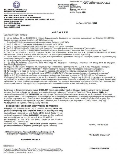 Σύμφωνα με την από 4 Ιανουαρίου 2018 απόφαση της γενικής γραμματέα Τουρισμού, Ευρυδίκης Κουρνέτα, «εγκρίνουμε τη δέσμευση πίστωσης ύψους: 21.056,40 ευρώ (είκοσι μίας χιλιάδων πενήντα έξι ευρώ σαράντα λεπτών) για την πληρωμή ισόποσης δαπάνης σε βάρος της πίστωσης του προΰπολογισμού εξόδων του Υπουργείου Τουρισμού Ειδικός Φορέας 1045 – 101, αναλυτικό λογαριασμό εξόδων 2420402001, οικ.ετος 2019 για Πληρωμή εξόδων από την μετακίνηση της Υπ.Τουρισμού Έλ. Κουντουρά στο Τορόντο από 8 -12/1/19 προκειμένου να συναντηθεί με τον ομόλογό της να κάνει επαφές με εταιρείες αερομεταφορών και στη συνέχεια θα μεταβεί στη Σαγκάη από 13-18/1/19 όπου θα εγκαινιάσει το Ελληνικό Περίπτερο στη Ζώνη ελεύθερου εμπορίου στη Σαγκάη.