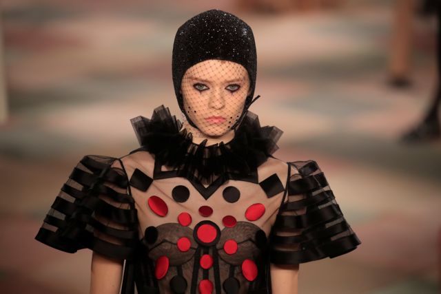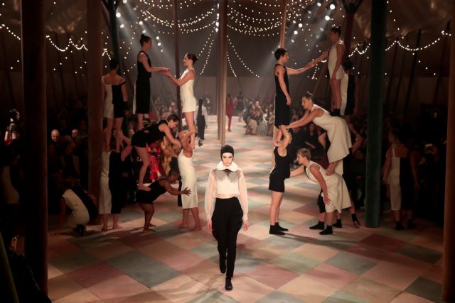 Τα μοντέλα, με μάτια έντονα βαμμένα μαύρα και ένα μαύρο δάκρυ να κυλά, με κόμμωση αρλεκίνων, φορούσαν μικρά βέλα και παρουσίασαν τη νέα κολεξιόν του γαλλικού οίκου μέσα σε μια σκηνή τσίρου εγκατεστημένη για τις ανάγκες του ντεφιλέ στους κήπους του μουσείου Ροντέν.