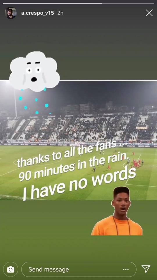 «Ένα ευχαριστώ σε όλους τους οπαδούς μας. 90 λεπτά μέσα στη βροχή. Δεν έχω λόγια» έγραψε ο Κρέσπο στη φωτογραφία της βροχερής Τούμπας που ανέβασε στο instagram.