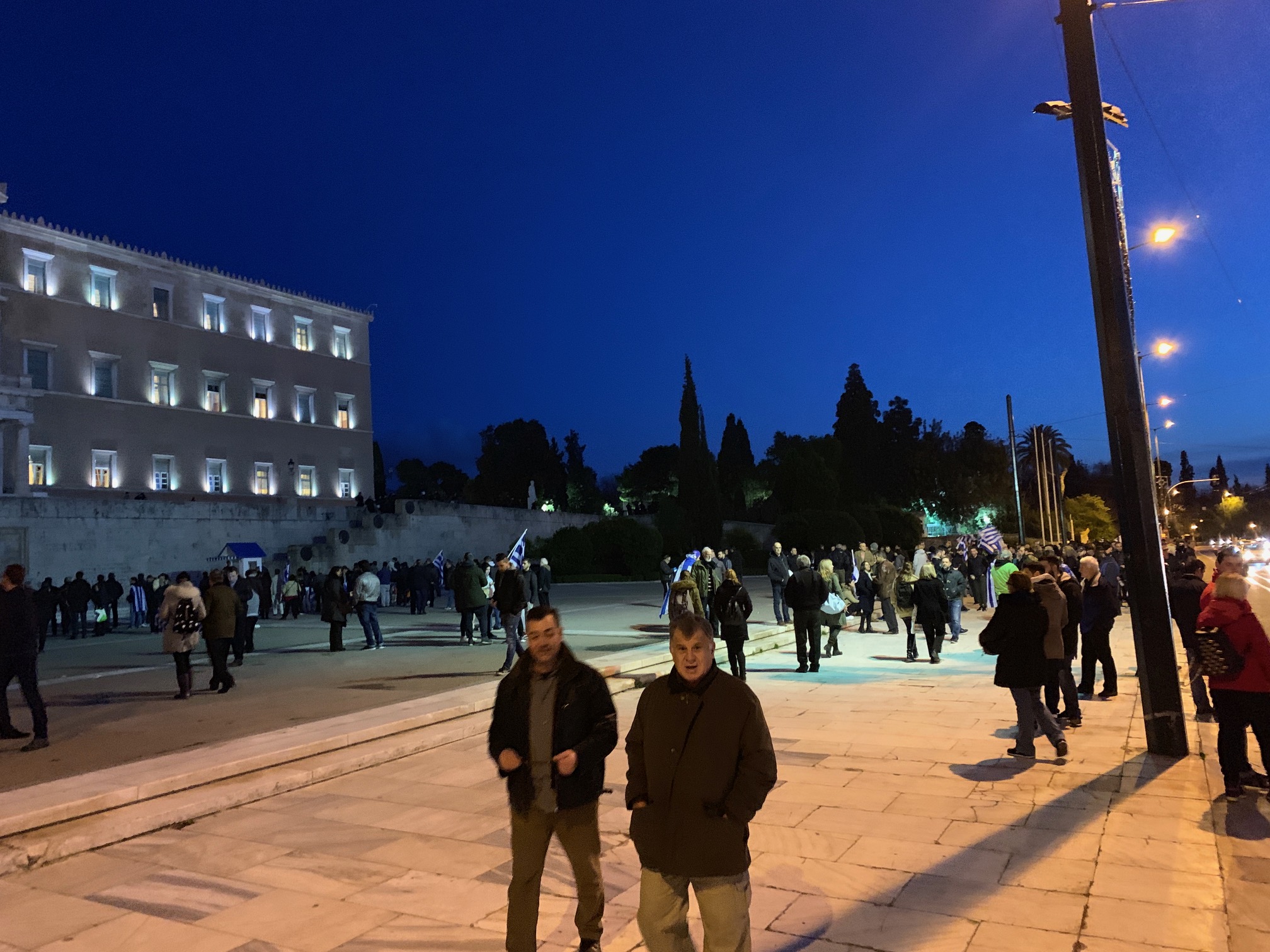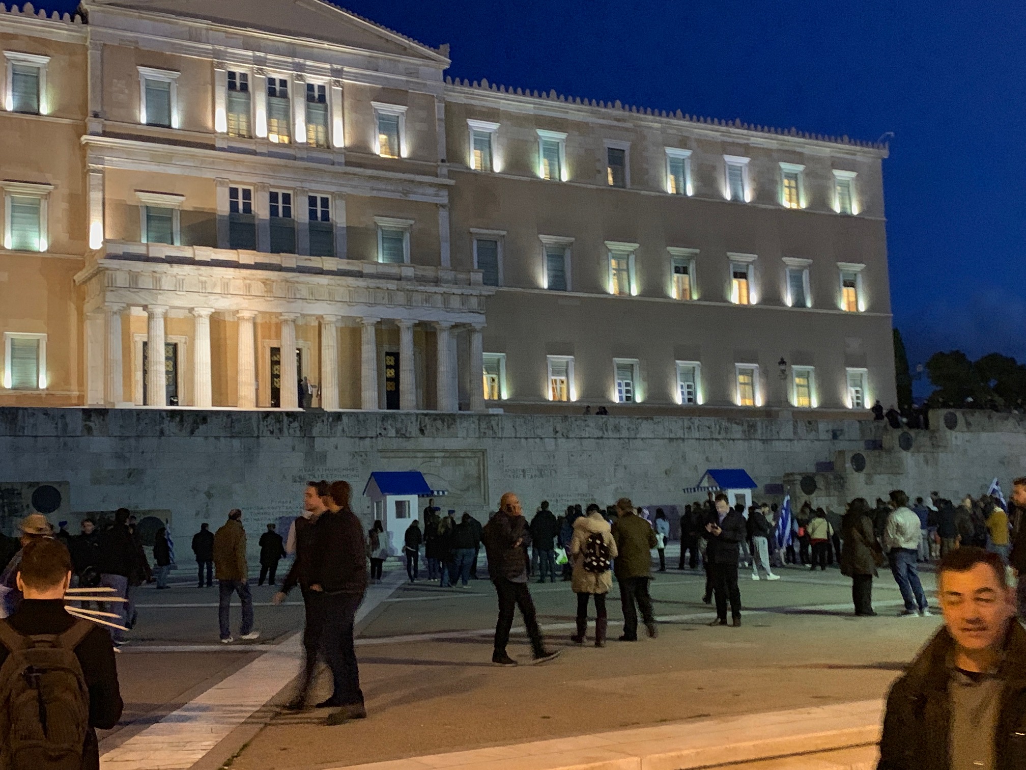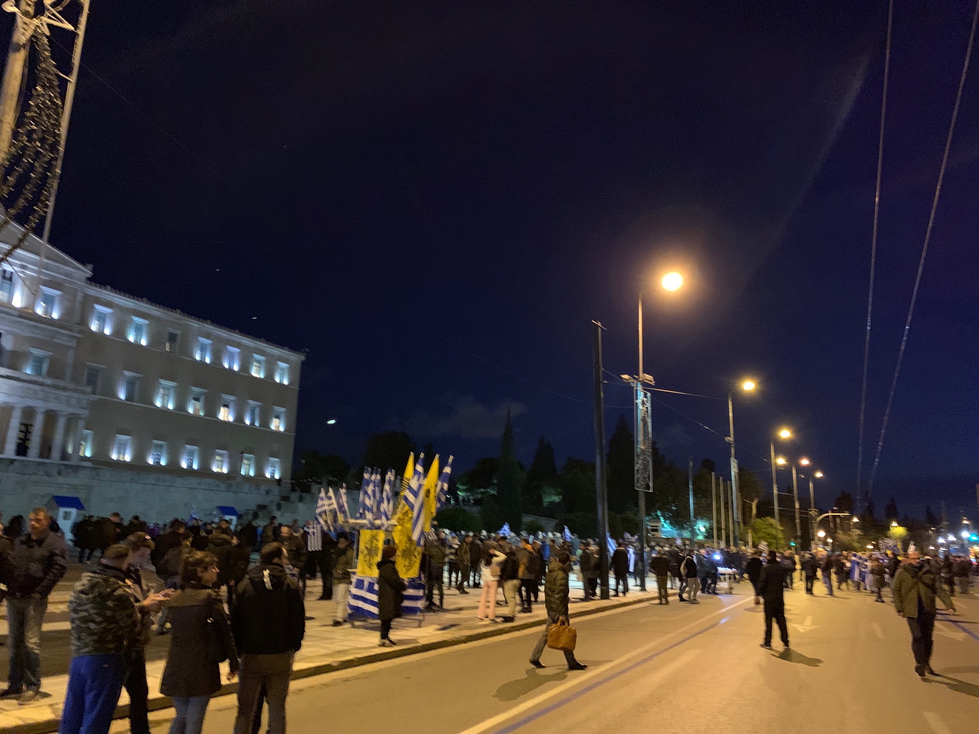 Οι πρώτοι διαδηλωτές άρχισαν να φτάνουν περίπου στις 18:00 έξω από τη Βουλή, κρατώντας ελληνικές σημαίες.