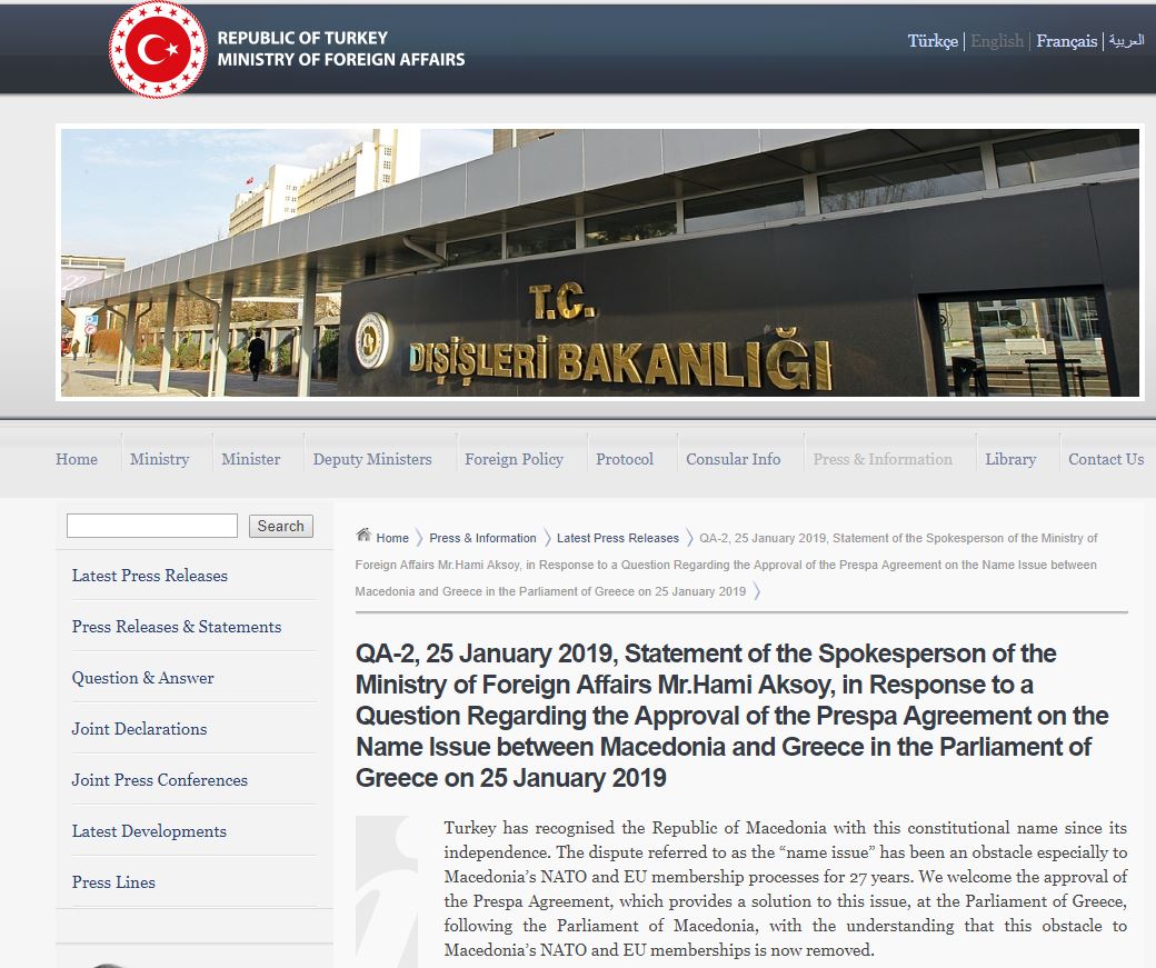 Με διθυραμβικά σχόλια υποδέχτηκε η Τουρκία την κύρωση της Συμφωνίας των Πρεσπών από τη Βουλή των Ελλήνων, με το τουρκικό υπουργείο Εξωτερικών να χαιρετίζει την συγκεκριμένη εξέλιξη αναφέροντας τη γείτονα χώρα όχι ως «Βόρεια Μακεδονία», αλλά ως «Μακεδονία», διατηρώντας το όνομα με το οποίο την έχει αναγνωρίσει αμέσως μετά την ανεξαρτητοποίηση της από την ενιαία Γιουγκοσλαβία.