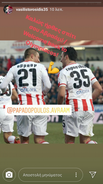 Ο Βασίλης Τοροσίδης με ανάρτηση του στον προσωπικό του λογαριασμό στο Instagram έσπευσε να καλωσορίσει τον παλιό του συμπαίκτη στους «ερυθρόλευκους», γράφοντας χαρακτηριστικά: «Αβραάμ καλωσόρισες στο σπίτι σου!».