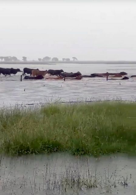 Φωτογραφίες στα μέσα κοινωνικής δικτύωσης εικονίζουν πολυάριθμα βοοειδή παγιδευμένα σε κομμάτια γης που δεν έχουν πλημμυρίσει, αλλά περιβάλλονται από νερό, ή νεκρά και ετοιμοθάνατα μέσα στη λάσπη.