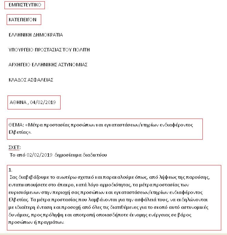 Στους αστυνομικούς των Υπηρεσιών σας που διατίθενται για την υλοποίηση των μέτρων προστασίας των προαναφερθέντων (προσώπων και εγκαταστάσεων/κτηρίων), να δοθούν οι δέουσες εντολές και οδηγίες για τον τρόπο εκτέλεσης των καθηκόντων/αποστολής τους και προκειμένου να αναφέρουν άμεσα οποιοδήποτε περιστατικό ήθελε υποπέσει στην αντίληψή τους και στρέφεται κατά της ασφάλειάς τους». Κι αυτός λοιπόν ο …συναγερμός της ΕΛΑΣ για επίθεση σε ελβετικό στόχο, οδήγησε στην ανεμπόδιστη εισβολή του «Ρουβίκωνα» στην πρεσβεία της εν λόγω χώρας. Προκαλώντας νέα ερωτήματα για την εικόνα διάλυση της ΕΛΑΣ.