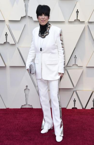 Η υποψήφια για Όσκαρ Καλύτερου Πρωτότυπου Τραγουδιού, Νταϊάν Ουόρεν εμφανίστηκε με λευκό κοστούμι με ασημένιες ρίγες στο πλάι.
