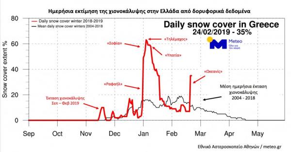 Η έκταση χιονοκάλυψης, όπως εκτιμήθηκε από δορυφορικά δεδομένα τα οποία επεξεργαστήκαμε στο Εθνικό Αστεροσκοπείο Αθηνών / meteo.gr, έφτασε σε υψηλό για το τελευταίο 10ημερο Φεβρουαρίου, τουλάχιστον από το 2004 που διαθέτουμε δεδομένα, με το χιόνι να καλύπτει το 35% της χερσαίας έκτασης της χώρας μας ή περίπου 45.900 τετραγωνικά χιλιόμετρα, ενώ την ίδια ημέρα πέρυσι το 2018 (κακοκαιρία «Λητώ») η χιονοκάλυψη είχε έκταση περίπου 40.300 τετραγωνικά χιλιόμετρα.