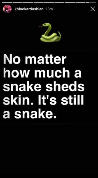 Για να ξορκίσει το κακό η Κλόε ανέβασε ένα story στο Instagram στο οποίο έγραφε: “Νο matter how much a snake sheds skin. It’s still a snake”, που σημαίνει “Δεν έχει σημασία πόσο δέρμα πετάει ένα φίδι. Παραμένει φίδι.”