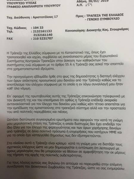 Αναφερόμενος στον έλεγχο που έγινε στο δάνειο του υποστηρίζει μεταξύ άλλων στην επιστολή, ότι επικοινώνησε τηλεφωνικά με τον Γιάννη Στουρνάρα και του επεσήμανε ότι ορθώς η Τράπεζα επέδειξε ακαριαία αντανακλαστικά για τον έλεγχο του δανείου του, καθώς κάτι τέτοιο απαιτείται για την εμπέδωση της εμπιστοσύνης στο τραπεζικό σύστημα αλλά και την προστασία του από πολιτικές παρεμβάσεις και πιέσεις. Συνεχίζει ωστόσο υποστηρίζοντας ότι ωστόσο «διατύπωσα συγκεκριμένα ερωτήματα που αφορούν την κατά τη γνώμη μου μεροληπτική στάση της Τράπζας η οποία δυστυχώς δεν έχει επιδείξει τον ίδιο ζήλο για τον έλεγχο της γερεγγυότητας και των όρων χορήγησης δανείων από τράπεζες σε άλλα πολιτικά πρόσωπα ή επιχειρήσεις που κατέχουν ΜΜΕ και για τα οποία έχει καταγγελθεί δημοσίως πως δεν εξυπηρετούνται».
