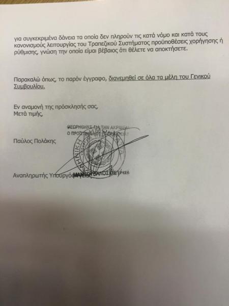 Ο Παύλος Πολάκης ανέβασε την επιστολή στο Facebook αναφέροντας χαρακτηριστικά: «Σήμερα το πρωί παραδόθηκε η παρακάτω επιστολή στα μέλη του Γενικού Συμβουλίου της Τράπεζες της Ελλάδας (κοινοποίηση και στο διοικητή της). Θα είχε παραδοθεί από τη Δευτέρα το πρωί αλλά δυστυχώς συνέβη η τρομερή θεομηνία στην Κρήτη».