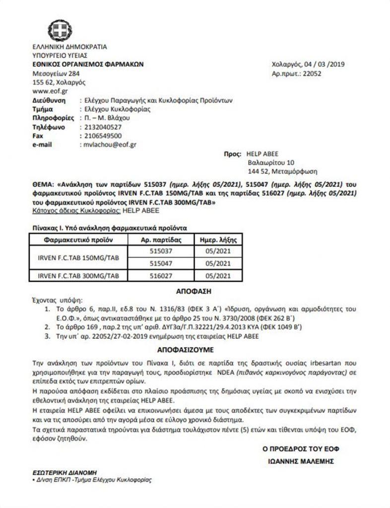 Την ανάκληση συγκεκριμένων παρτίδων του φαρμάκου Irven F.C. Tab 150mg και Irven F.C. Tab 300 mg αποφάσισε ο Εθνικός Οργανισμός Φαρμάκων. Σύμφωνα με την ανακοίνωση του ΕΟΦ, σε παρτίδα της δραστικής ουσίας irbesartan που χρησιμοποιήθηκε για την παραγωγή των ανωτέρω προϊόντων, προσδιορίστηκε NDΕA (πιθανός καρκινογόνος παράγοντας) σε επίπεδα εκτός των επιτρεπτών ορίων.