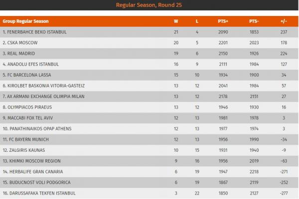 Η βαθμολογία ύστερα από 25 αγωνιστικές στη Euroleague
