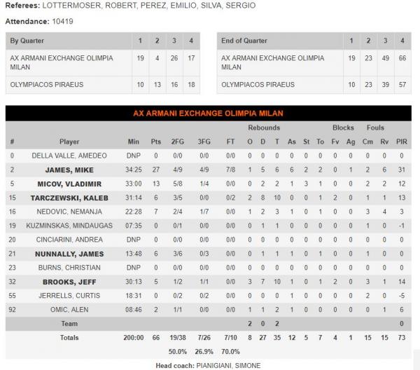 Οι Ερυθρόλευκοι είδαν τον Βασίλη Σπανούλη να τραυματίζεται στα μέσα του δεύτερου δεκαλέπτου και εν τη απουσία του Γιάνις Στρέλνιεκς ήταν απογοητευτικοί στην επίθεση, παρότι έριξαν τους Ιταλούς 20 πόντους κάτω από τον μέσο όρο τους! Και όμως ο Μάικ Τζέιμ ήταν εκπληκτικός, σταμάτησε στους 27 πόντους και με 6 ασίστ, διέλυσε κάθε αμυντικό πλάνο του Μπλατ και έδωσε μία πολύτιμη νίκη στην ομάδα του.